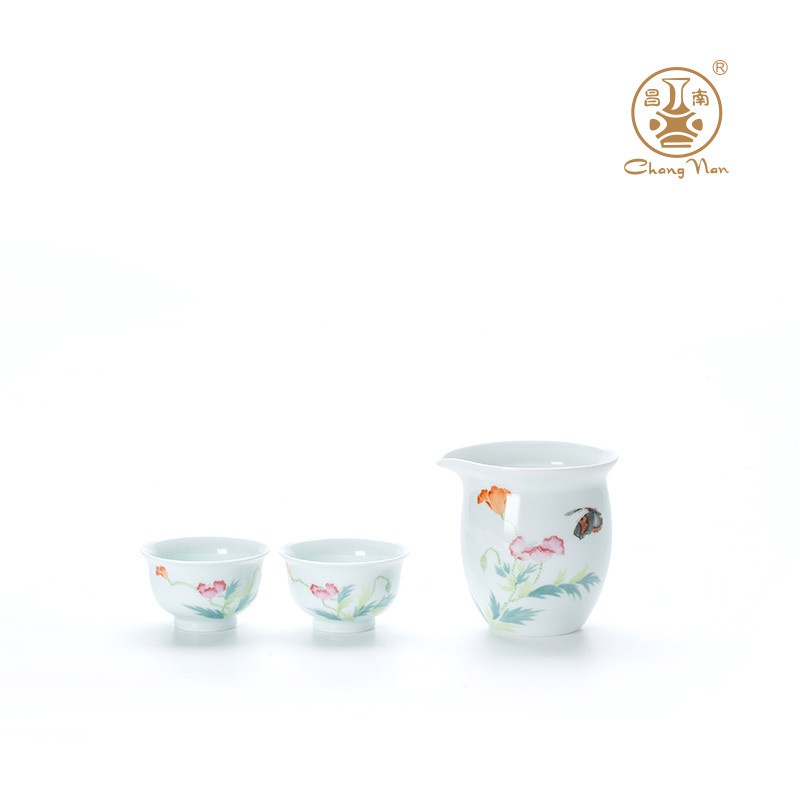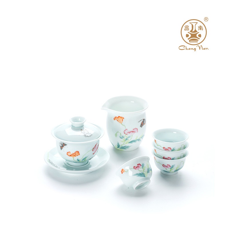 玉瓷手繪“蝶戀花”8頭蓋碗茶具套裝